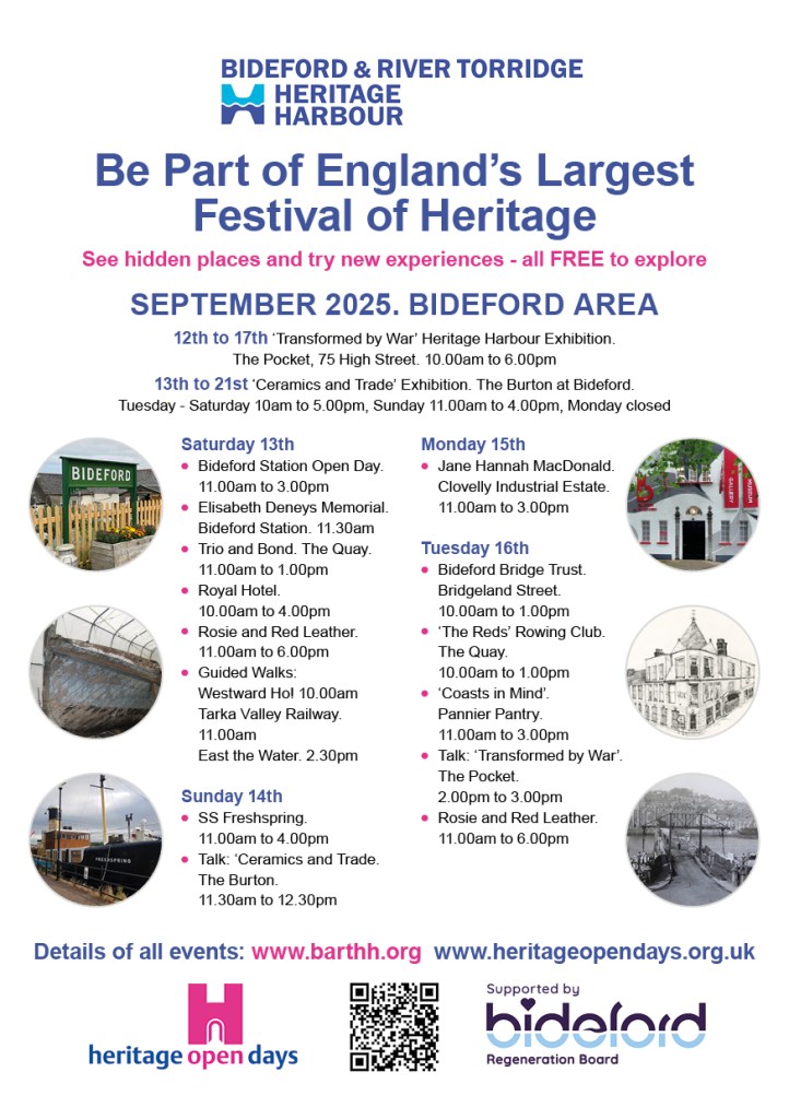Working with our partners Bideford & River Torridge Heritage Harbour have prepared a programme of events celebrating heritage in Bideford and surrounding area.