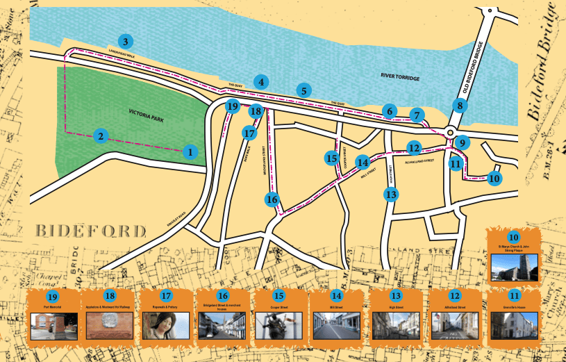 Self Guided walk map around Bideford Quays and streets. About 1 hour. No steps or steep hills.