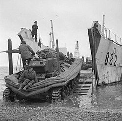 Film of a Valentine DD disembarking from landing craft LCT 340 making its way ashore during sea trials in 1943. The Duplex Drive (DD) ‘swimming’ tanks were amphibious tanks fitted with a canvas flotation screen to give the tank enough buoyancy to support its weight without having to sacrifice armour or firepower. The duplex drive engine powered propellers in water and tracks on land.