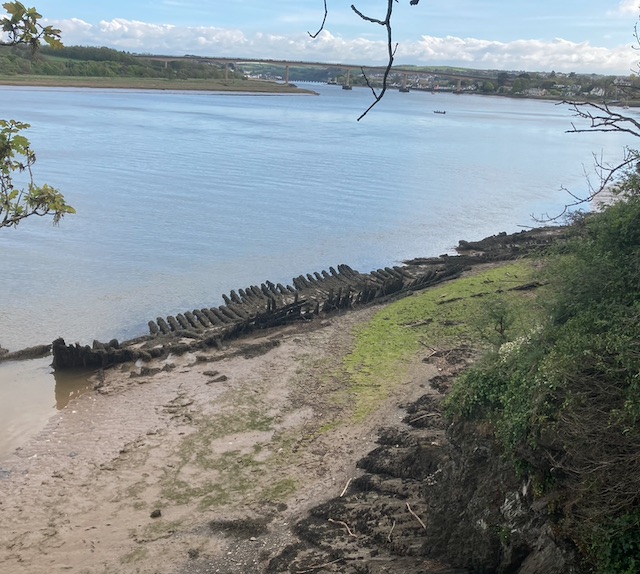 Schooner M.A. James : many wooden schooners were requisitioned for tethering barrage balloons, as defence against aeroplanes, in ports around the UK. The M.A.James was taken to Plymouth and abandoned after the war, her remains are visible from the South West Coast path in the mud at low tide. Take care steep cliffs, soft mud, fast moving tides.