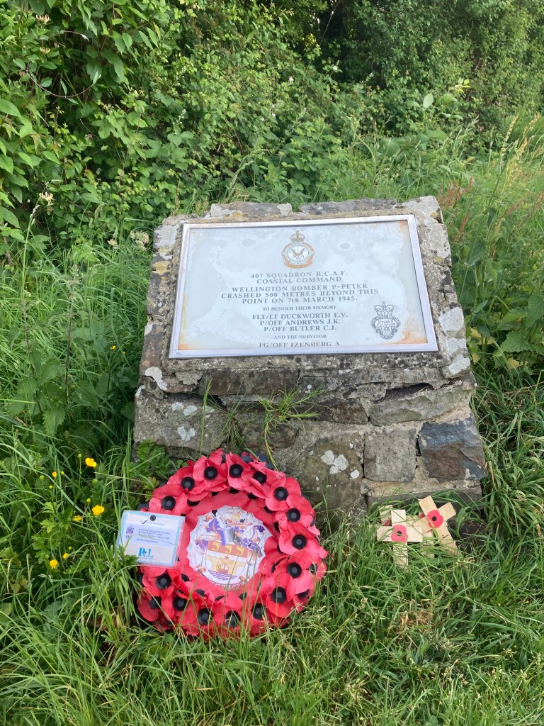 Wellington Bomber crash site memorial : on the 7 March 1945, a Wellington aircraft from 407 Canadian squadron at RAF Chivenor, near Barnstaple, crashed at Round Hill, East the Water, after engine failure, 4 minutes after take-off on a training flight. It clipped a building 60 feet up on the east bank of the Torridge and just missed the Gas Works.